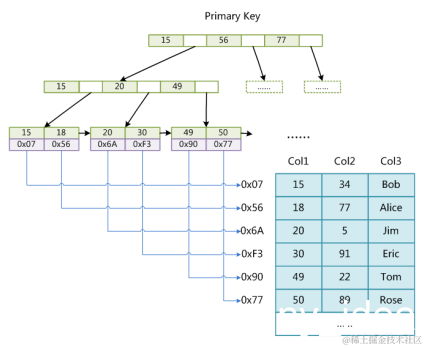 主键索引里面的存储情况如下图所示,叶子节点里面的key是索引的信息,value是数据表里面该索引对应行的数据信息。