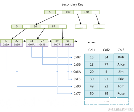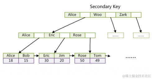 这种索引在进行存储的时候,虽然说节点依然是key-value的结构,key对应的是相应的索引,但是value对应的却是主键索引的值。如下图所示: