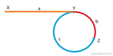 如下图所示,X,Y,Z分别为链表起始位置,环开始位置和两指针相遇位置,则根据快指针速度为慢指针速度的两倍,可以得出: