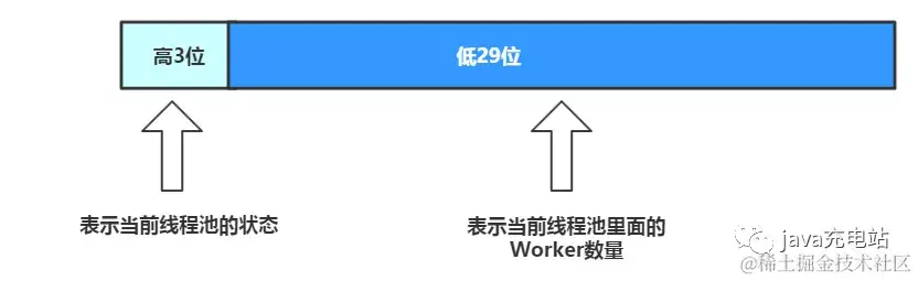 在这段代码里面,有个关键的变量叫做ctl , 该变量的主要作用是对线程池的整体运行状态和线程池中的worker线程数量进行控制的字段,这里我们可以理解为通过二进制的转换将线程池的运行状态和worker数量统一用一个数值变量来表示,该变量的高3位表示为当前线程池的状态,低的29位表示为当前worker线程的数量。