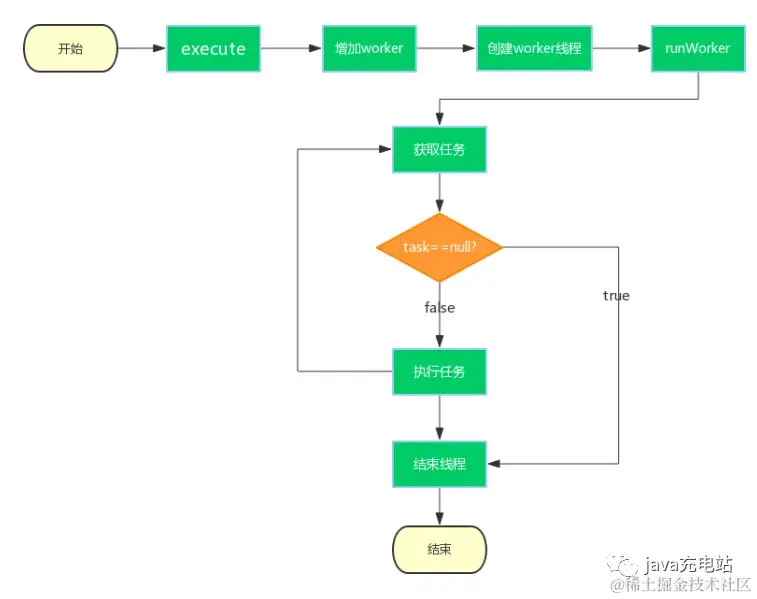 至此,processWorkerExit执行完之后,工作线程被销毁,以上就是整个工作线程的生命周期,从execute方法开始,Worker使用ThreadFactory创建新的工作线程,runWorker通过getTask获取任务,然后执行任务,如果getTask返回null,进入processWorkerExit方法,整个线程结束,如图所示: