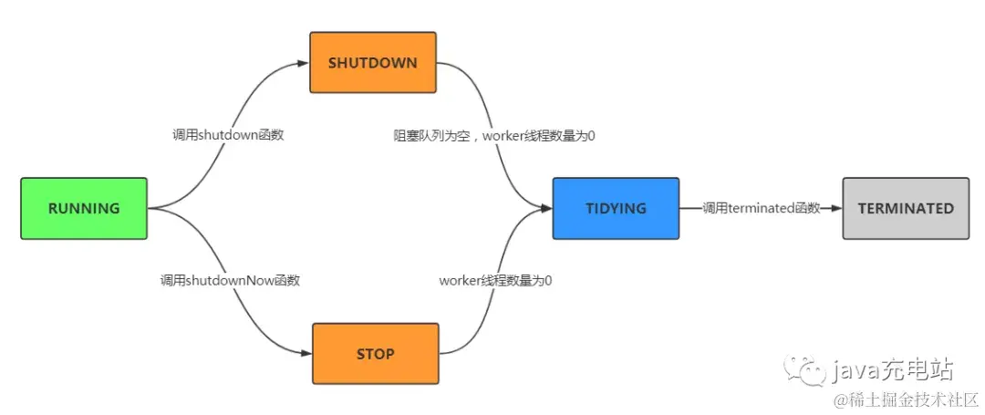 (1) 状态说明:当所有的任务已终止,ctl记录的”任务数量”为0,线程池会变为TIDYING状态。当线程池变为TIDYING状态时,会执行钩子函数terminated()。terminated()在ThreadPoolExecutor类中是空的,若用户想在线程池变为TIDYING时,进行相应的处理;