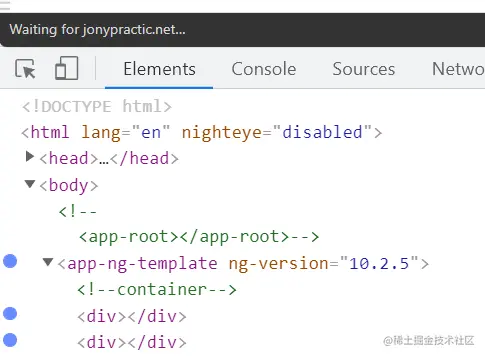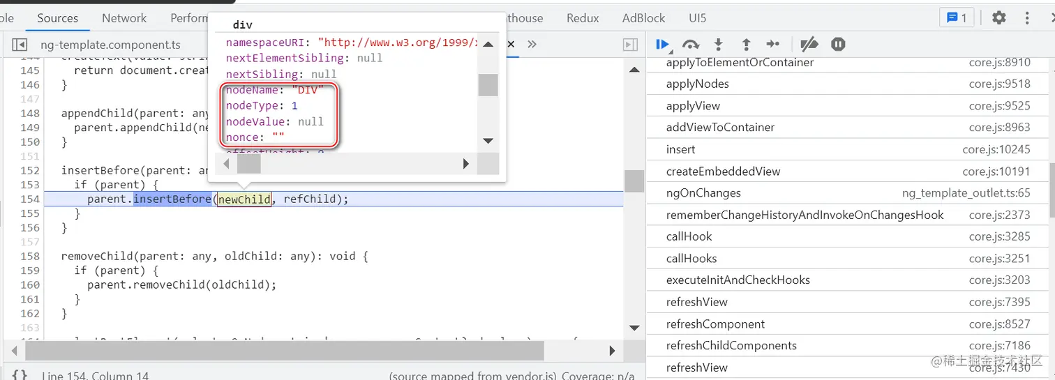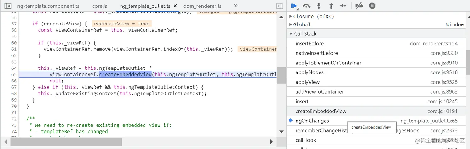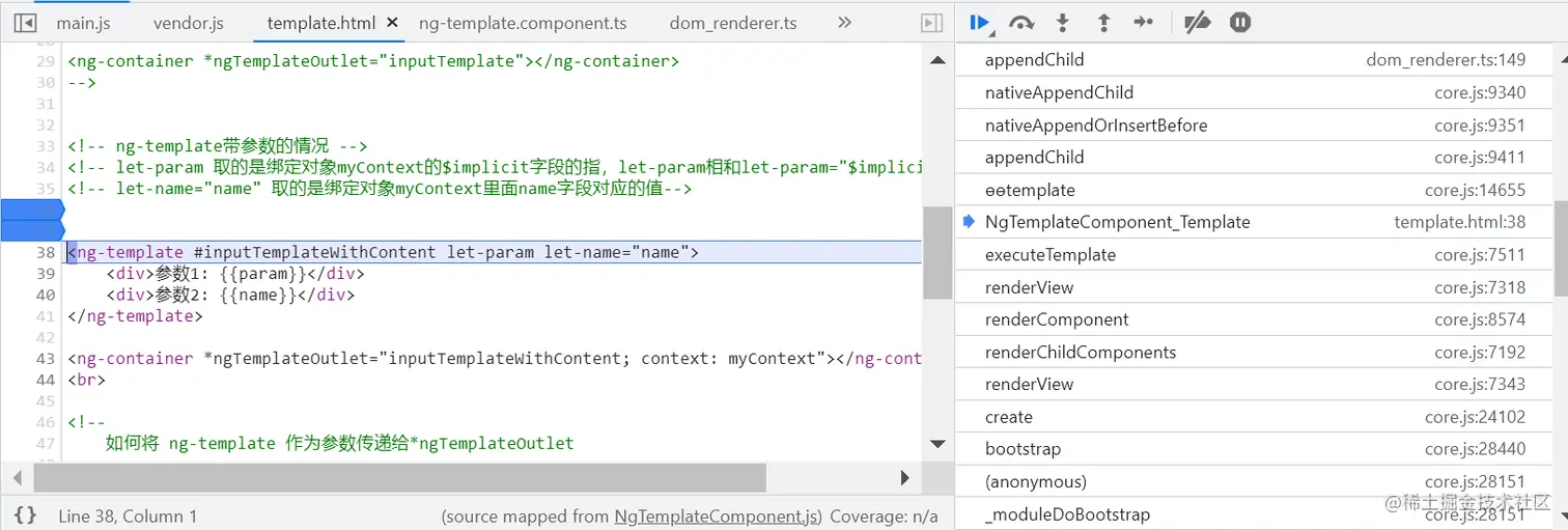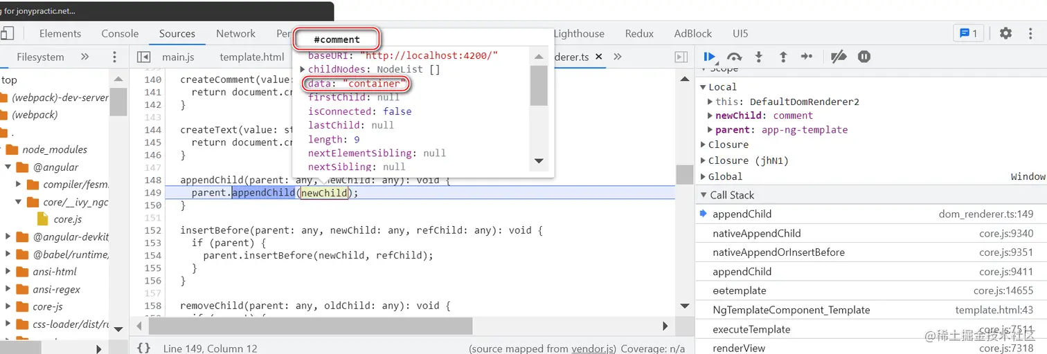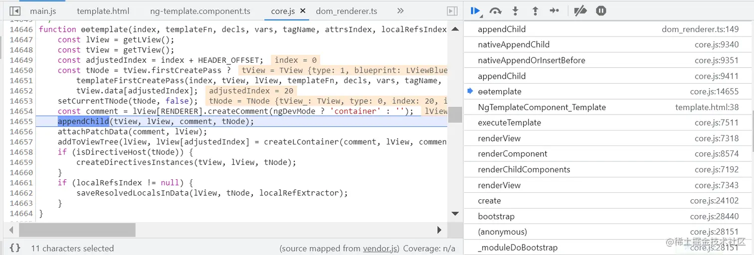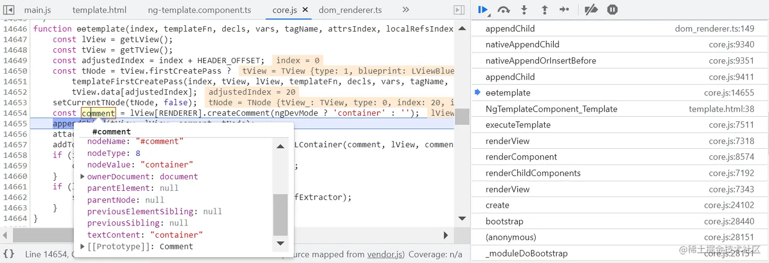 因为 ng-template 并不会直接出现在最终渲染的 HTML 代码里,而是将其内部包裹的 HTML 原生标签,使用浏览器原生的 native API appendChild,动态插入到 DOM 树中。如下图所示: