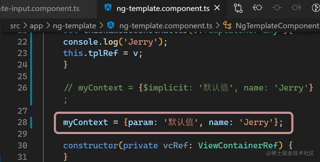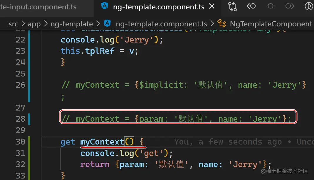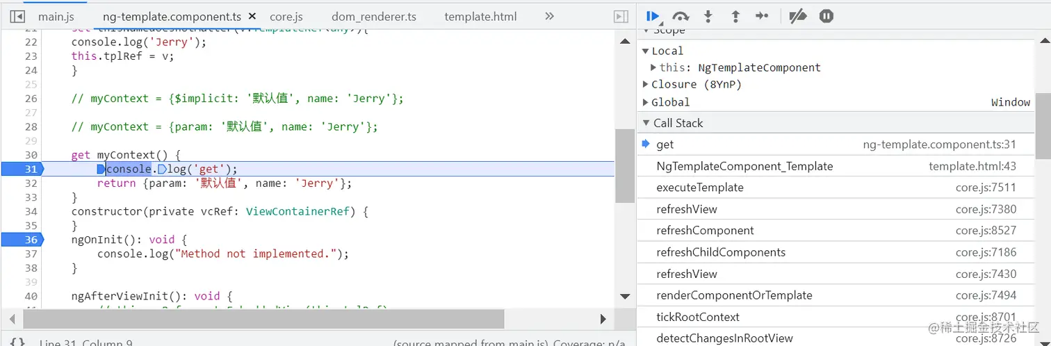 我们可以使用一个小技巧:将 myContext 替换成一个 get 函数,这样我们就可以在 get 函数里设置断点进行调试,从而找到 template 上下文参数传递的准确代码位置了。