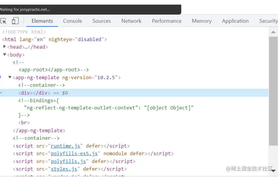 上述代码被执行后,我们在 Chrome 开发者工具里看到了一个空的 div 标签:
