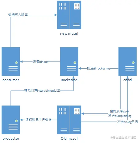 这样新产生的数据就能用户无感知的处理了,有的同学会问那老的用户数据怎么办呢,别急接下来tom哥会说老的数据怎么办,既然都统一通过binlog订阅处理这种模式来进行数据入库,那能不能我写个客户端程序,把历史数据模拟成binlog的插入模式,发送到mq,由mq订阅消费处理呢,逻辑图参考如下: