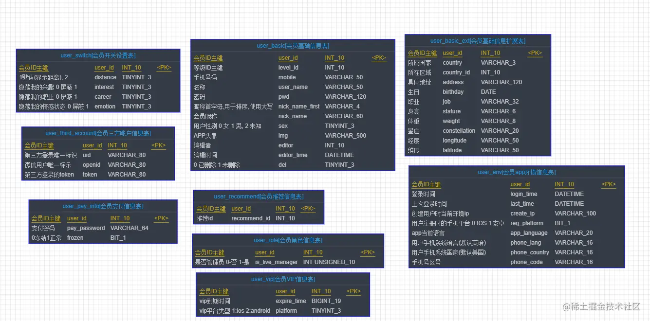 tom哥刚来公司的时候,一看用户表,妈呀将近100个字段,各种各样纬度的字段,昵称基本信息不说了,还有什么点赞数量、收入量,是不是vip等等乱起八遭的数据全部都冗余在了用户表,完全不符合数据库设计三范式的原则,并且缓存设计也是经典的把一行数据对应的model直接存到redis内,导致一个用户数据在缓存占用将近300多kb,可真不小。并且现有的用户表的数据早已经过了千万,按照mysql的单表500W的原则,也是时候做横向拆分了。