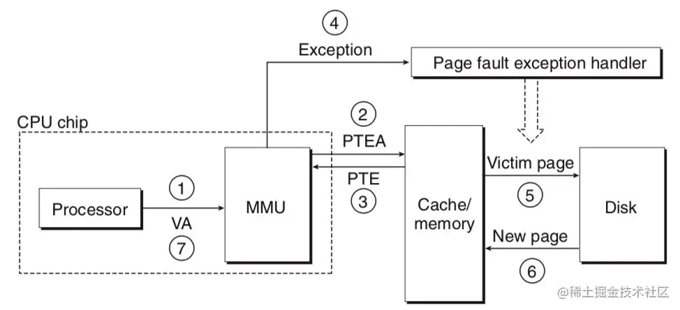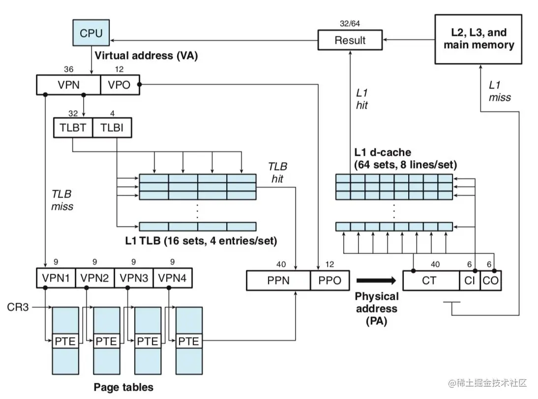 当 CPU 拿到一个虚拟地址希望访存的时候,将其分为虚拟页框号和便宜两个部分,先拿着虚拟页框号查 TLB,TLB 命中就直接将物理页框号和偏移拼接起来得到物理地址。在拿着物理地址进行访存。访存的时候也是先看缓存汇总是否有,没有的话再访问下一级存储器。如果 TLB 没有命中的话,就利用CR3寄存器(存储当前进程的一级页表基址)逐级地查页表。