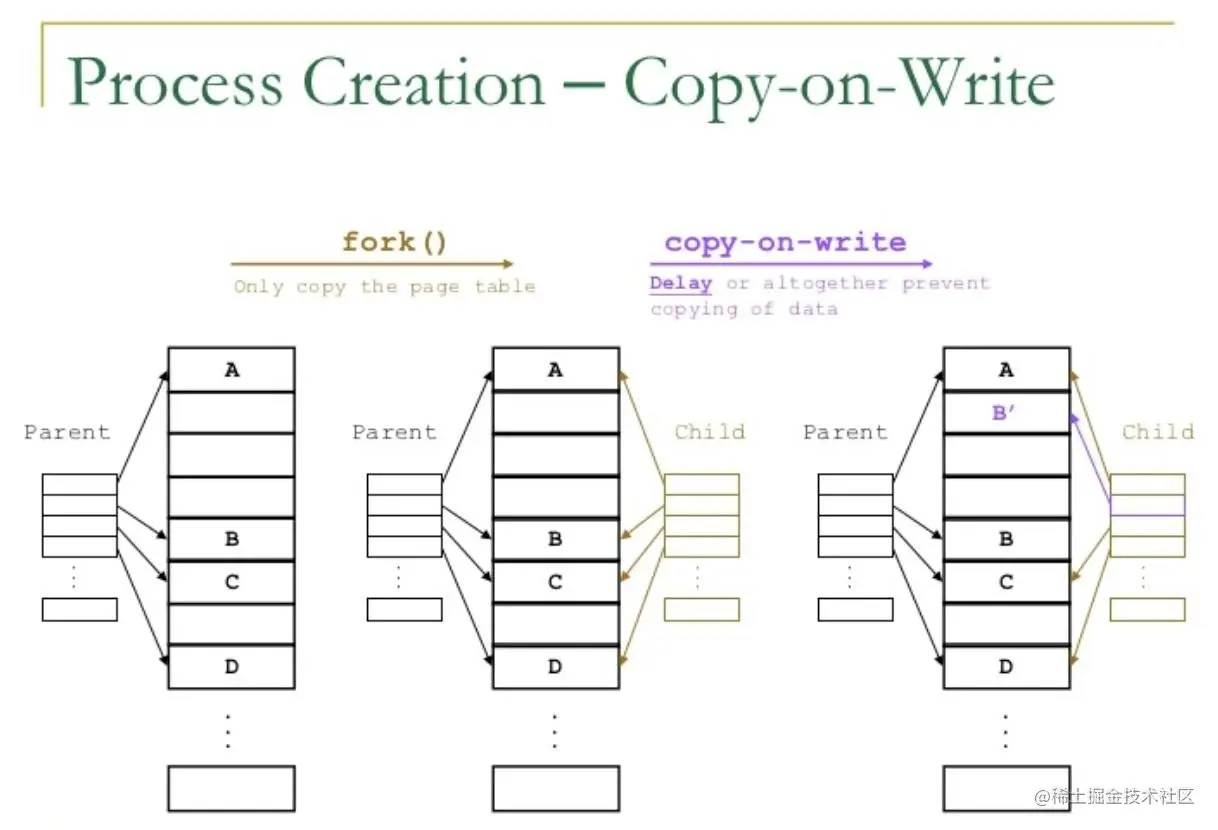 写时复制技术将内存页的复制延迟到第一次写入时,更重要的是,在很多情况下不需要复制。这节省了大量时间,充分使用了稀有的物理内存。