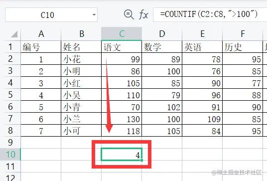 步骤二: 计算完毕后,如下图所示,语文成绩大于100分的同学有4位。