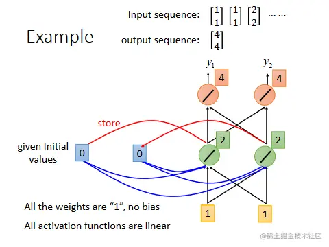 此时对于neuron来说,不只接到了来自input的[1 1],而且还接到了来自memory的[0 0],因为所有的weight都是1,所以此时neuron的output都是2,接下来因为所有的weight都是1,所以两个红色的neuron的output都是4.