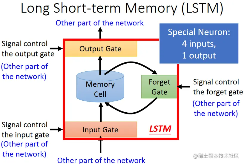 LSTM有三个gate,当neural的某个output想要被写入到memory cell里面的时候,必须先经过一扇门(input gate),只有当input gate打开之后才能将值写入到memory cell,当input gate关闭的时候,其他neural就无法将值写进去.input gate什么时候打开、什么时候关闭是由network自己学习得到的.