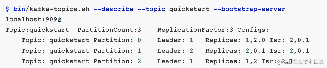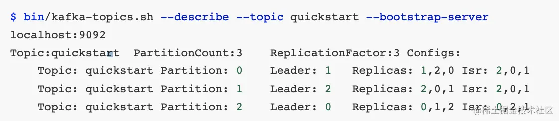 此时关闭broker0,那么对于分区2⽽⾔,存活的AR就变为[1,2],同时ISR变为[2,1]。此时查看主题 quickstart的具体信息,分区2的leader就变为了1⽽不是2。