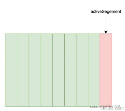 向 Log 中写入消息是顺序写入的。只有最后一个 LogSegement 才能执行写入操作,在此之前的所有 LogSegement 都不能执行写入操作。为了方便描述,我们将最后一个 LogSegement 成为"ActiveSegement",即表示当前活跃的日志分段。随着消息的不断写入,当 ActiveSegement 满足一定的条件时,就需要创建新的 activeSegement,之后在追加的消息写入新的 activeSegement。