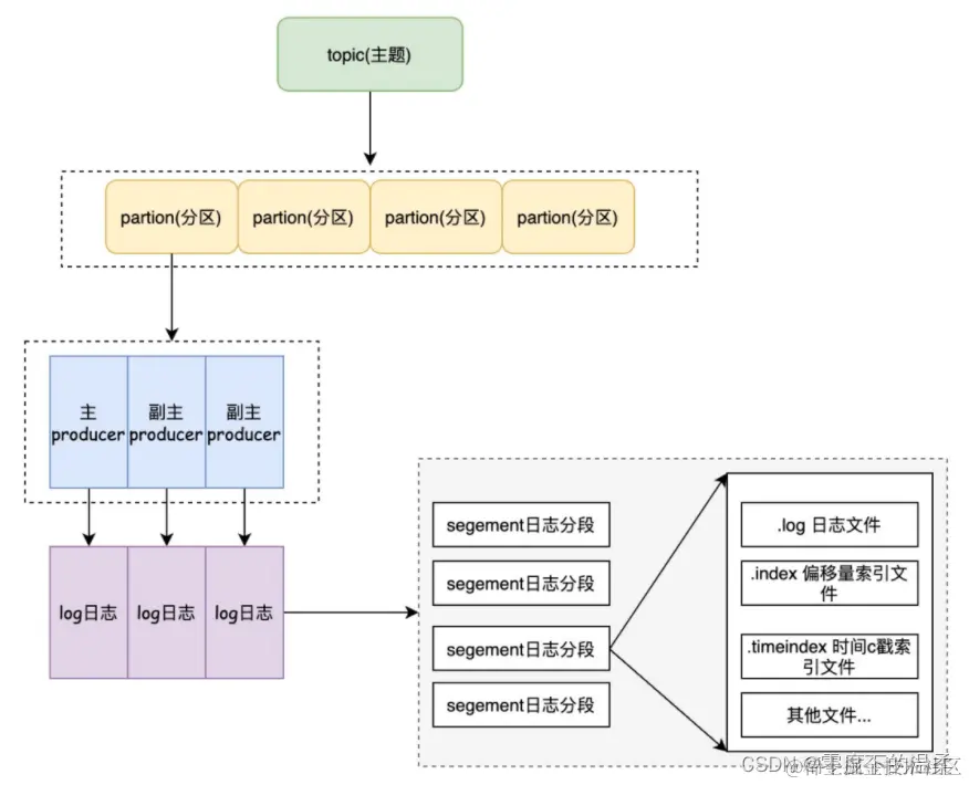 kafak 中的 Log 对应了一个命名为- 的文件夹。举个例子、假如有一个 test 主题,此主题下游 3 个分区,那么在实际物理上的存储就是 "test-0","test-1","test-2" 这三个文件夹。