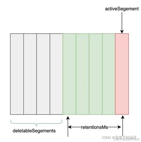 日志删除任务会检查当前日志文件中是否有保留时间超过设定的阈值(retentionMs)来寻找可删除的日志分段文件集合(deletableSegments),如图下图所示。retentionMs 可以通过 broker 端参数 log.retention.hours、log.retention.minutes 和 log.retention.ms 来配置,其中 log.retention.ms 的优先级最高,log.retention.minutes 次之,log.retention.hours 最低。默认情况下只配置了 log.retention.hours 参数,其值为 168,故默认情况下日志分段文件的保留时间为 7 天。
