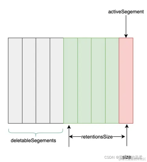 日志删除任务会检查当前日志的大小是否超过设定的阈值(retentionSize)来寻找可删除的日志分段的文件集合(deletableSegments),如下图所示。retentionSize 可以通过 broker 端参数 log.retention.bytes 来配置,默认值为-1,表示无穷大。注意 log.retention.bytes 配置的是 Log 中所有日志文件的总大小,而不是单个日志分段(确切地说应该为.log 日志文件)的大小。单个日志分段的大小由 broker 端参数 log.segment.bytes 来限制,默认值为 1073741824,即 1GB。