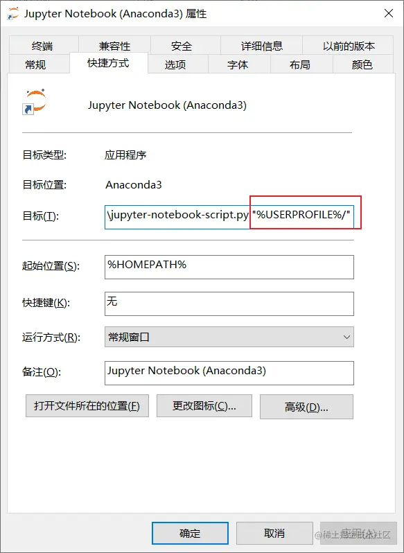 删除掉快捷方式–>目标中的”%USERPROFILE%/”,如下图,然后点击应用和确定