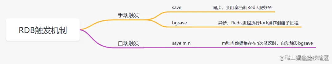 RDB持久化,是指在指定的时间间隔内,执行指定次数的写操作,将内存中的数据集快照写入磁盘中,它是Redis默认的持久化方式。执行完操作后,在指定目录下会生成一个dump.rdb文件,Redis 重启的时候,通过加载dump.rdb文件来恢复数据。RDB触发机制主要有以下几种: