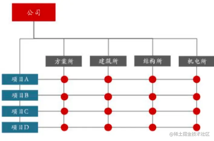 **5、矩阵型结构:**一种把按职能划分的部门同按产品、服务或工程项目划分的部门结合起来的组织形式。