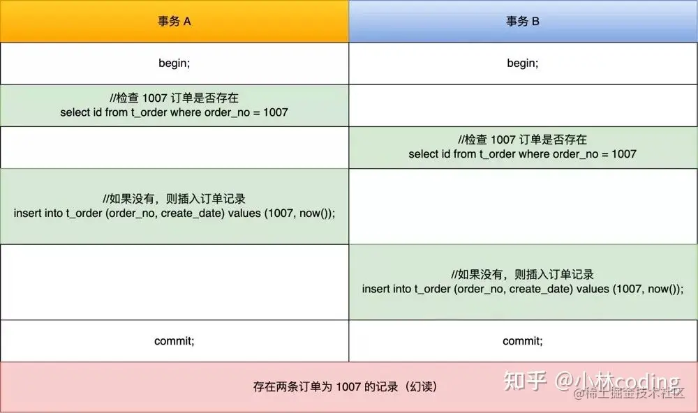 如果没有使用 select ... for update 语句,而使用了单纯的 select 语句,如果是两个订单号一样的请求同时进来,就会出现两个重复的订单,有可能出现幻读,如下图: