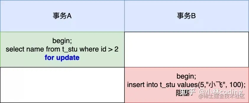 比如,下面事务 A 查询语句会锁住(2, +∞]范围的记录,然后期间如果有其他事务在这个锁住的范围插入数据就会被阻塞。