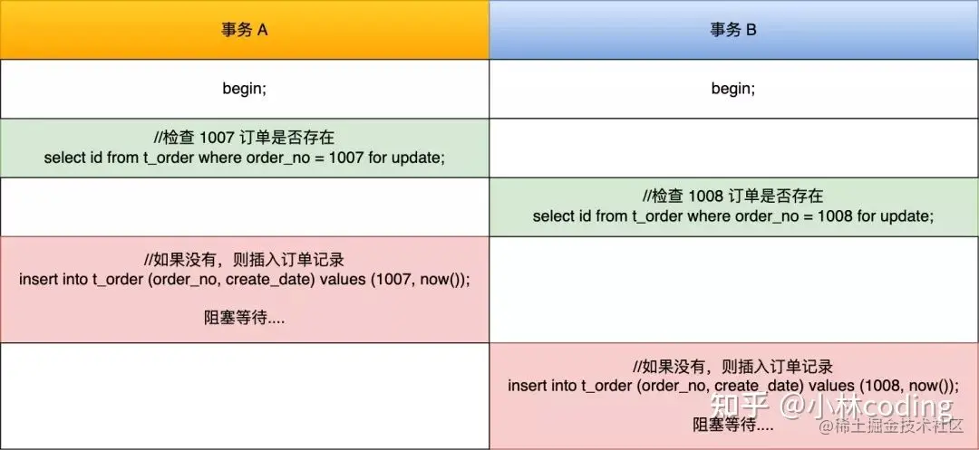 假设这时有两事务,一个事务要插入订单 1007 ,另外一个事务要插入订单 1008,因为需要对订单做幂等性校验,所以两个事务先要查询该订单是否存在,不存在才插入记录,过程如下: