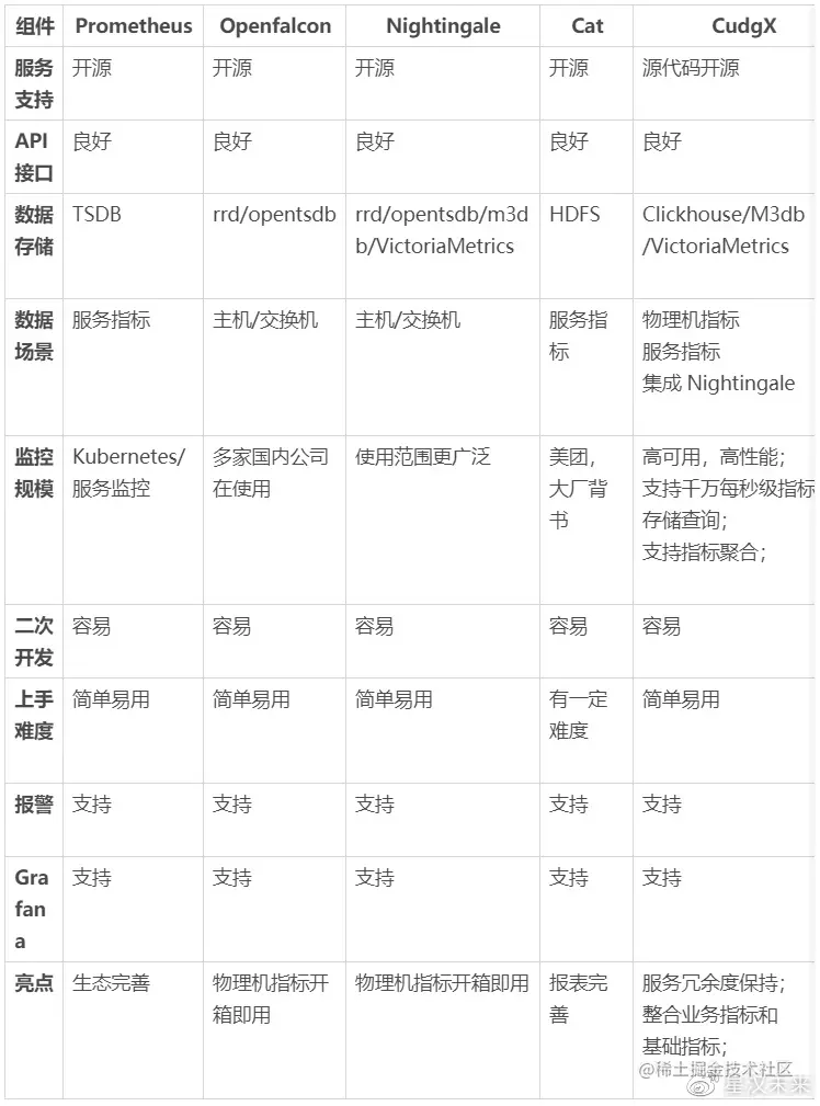 - 推荐使用 CudgX + Grafana 搭建监控系统 1.使用 CudgX 建立指标体系,CudgX 是源代码开放的智能诊断平台,具有高可用、高性能、服务负载评估、服务冗余度保持等功能特点,采用 CudgX 存储核心指标为服务自动扩缩容提供更高的可扩展性,同时 CudgX 兼容 Prometheus 生态,已有基于 Prometheus 的监控系统可以平滑迁移到 CudgX 系统。 2.Grafana 是目前最为流行的监控视图软件,并提供了简单易用的报警功能,团队规模较小时采用,既不会浪费太多运维时间,又能保证服务质量,还可以保证系统的可扩展性。