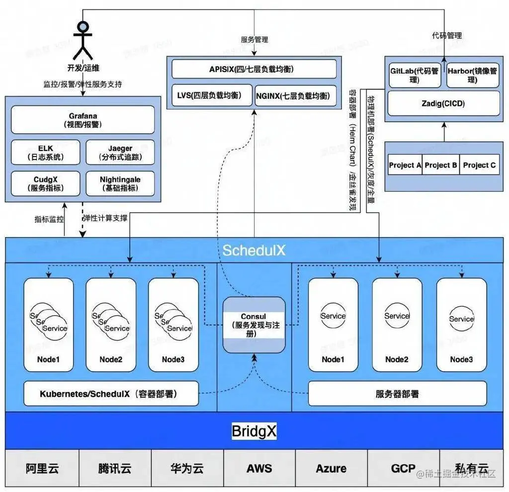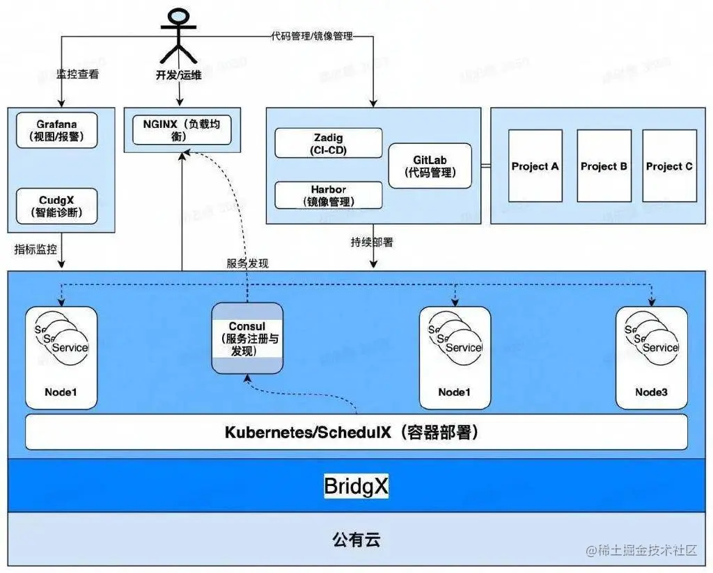 - 推荐使用 Kubernetes 服务部署,Kubernetes 是 Google 开源的服务部署平台,它具有开源、高效、稳定、社区庞大的优点。目前 Kubernetes 已经成为了云原生的标准服务部署平台,它大大减少了运维人员工作负担。在团队人数较少时采用 Kubernetes,不仅节省人力、服务部署升级效率高,还具有强大的系统可扩展性。采用 Kubernetes 部署服务流程描述如下: 1.使用 Kubernetes Deployment,YAML/Helm chart 部署服务; 2.使用 Kubernetes NodePort Service 进行服务发现,这种方式简单又高效; 3.通过 Nginx 暴露服务,Nginx 挂载 NodePort Service 后端地址。 4.Kubernetes 可以使用 BridgX 搭建,BridgX 支持管理公有云和私有云计算资源,基于 BridgX 搭建的运维系统可扩展性更高; 5.使用公有云计算资源底座,成本低,运维难度低。