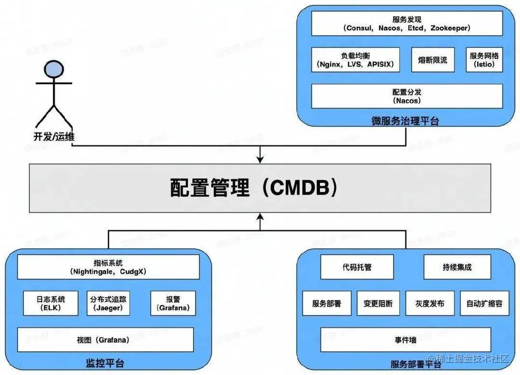 此模型企业内各服务和组件都趋于成熟,企业有高稳定性要求的核心服务,有专业的运维团队,需要完善的 DevOps 平台来保障复杂的微服务体系下的服务质量。企业更关注于系统平台化,将各类组件分门别类组合成为系统平台,并搭建 CMDB 管理服务元数据,按组织架构管理服务。