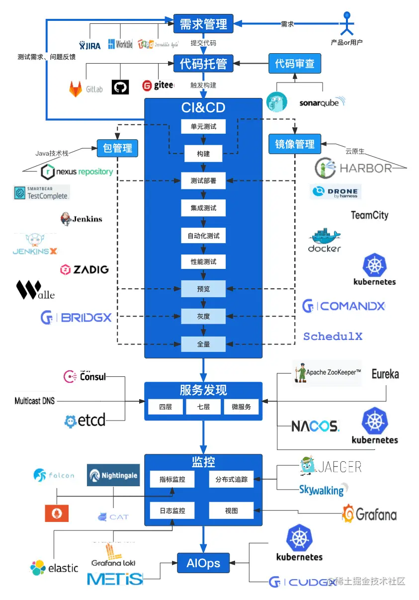 其中集成、部署、监控三个环节属于 DevOps 生命周期中核心环节,是本文主要关注点。贯穿云原生 DevOps 整个生命周期的工具链全景图如下: