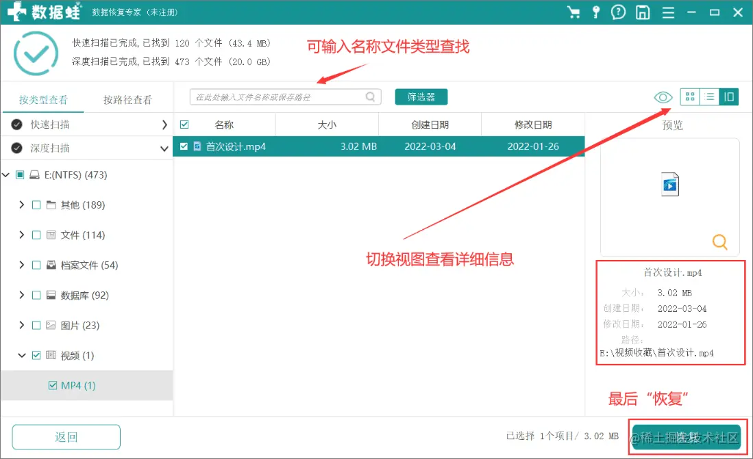 执行恢复操作: 当扫描结束,扫描结果全部出现后,就开始选择需要找回的视频吧!文件类型都显示在左侧,但你也可以通过搜索名称或者文件类型进行查找。通过切换视图查看详细信息,最后将需要找回的视频勾选即可开始“恢复“!