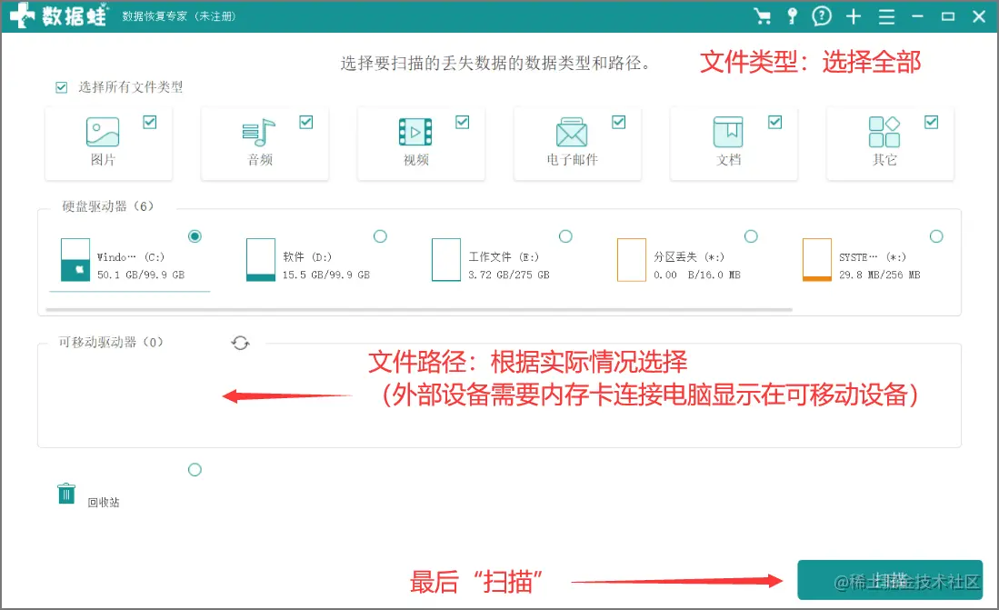 选择步骤执行: 选择所有的文件类型,丢失的即便只有视频,也是建议全选,因为这样扫描出来的结果才全面;而文件位置就视情况而定了(如果是相机、监控等设备的话需要取出内存卡经过读卡器连接电脑,然后才出现在可移动设备进行选择),最后选择完成就“扫描”吧!