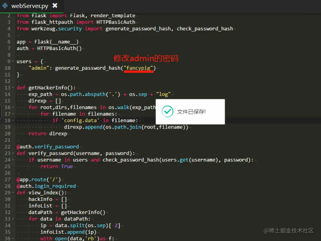 然后修改webServer.py中admin的密码,当然,你也可以更换用户名,这个根据个人习惯来修改。
