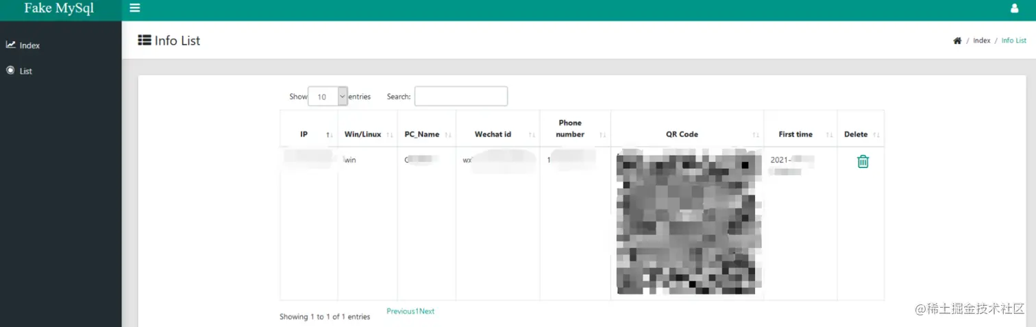 攻击者在使用navicat连接我们的数据库时成功后,我们可以执行代码,读取到它的手机号、微信号、地址
