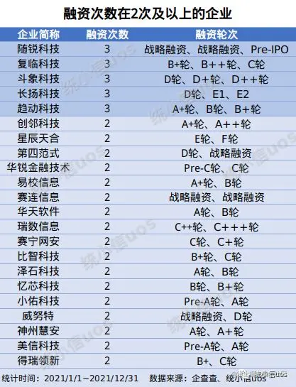 从融资阶段看,参与融资的105家信创企业中,有22家企业完成了两轮及以上轮次融资,随锐科技、复临科技、斗象科技、长扬科技和趋动科技等5家企业年内均完成3轮融资。其中,有9家企业的多起融资事件处在同一轮次,如斗象科技,三轮融资均在D轮阶段。