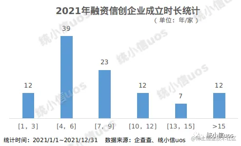 参与融资的105家信创企业,超7成企业成立时长在10年以下,其中成立4至6年的企业数量最多,共39家,占总样本的37.14%;成立时长在10至15年的企业共19家;成立15年以上的企业有12家。