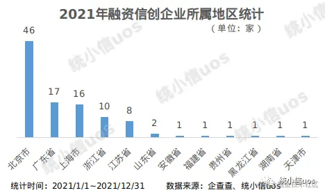 据统小信uos不完全统计,2021年信创领域共发生132起融资事件,涉及105家企业。105家企业成立时长跨度较大,超7成企业成立时长在10年以下。其注册地3/4集中在北上广等经济高度发达地区,东部沿海省份在信创领域的影响力也在逐步增强。
