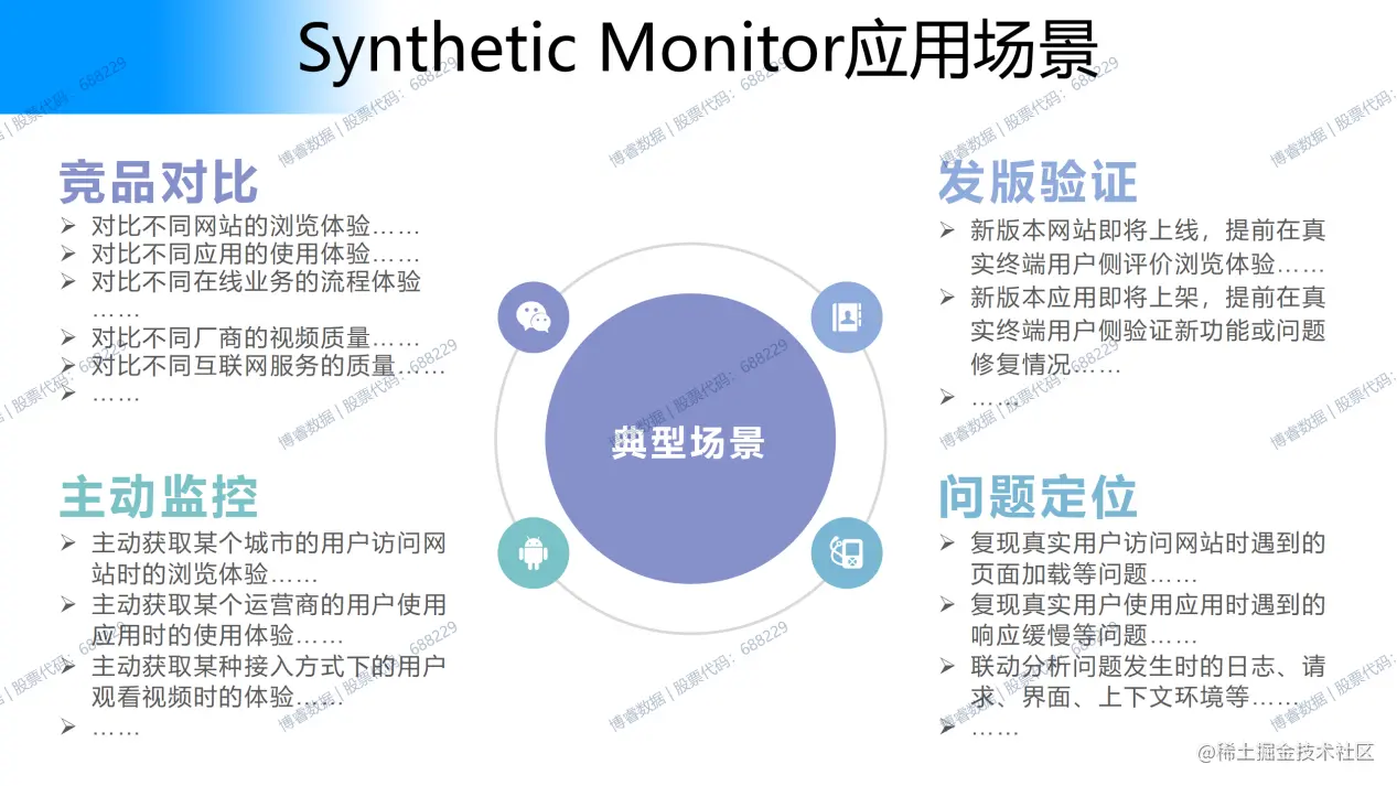 STM凭借其无需嵌码、主动监测的特性,具有独一无二的竞品对比应用场景,并可以完美应用在发版验证、主动监控、问题定位场景中,为企业在对比自身应用产品与友商差异、选型互联网服务、快速验证新版本应用、主动获取特定群体用户体验、完整复现应用BUG等时提供无与伦比的助力。