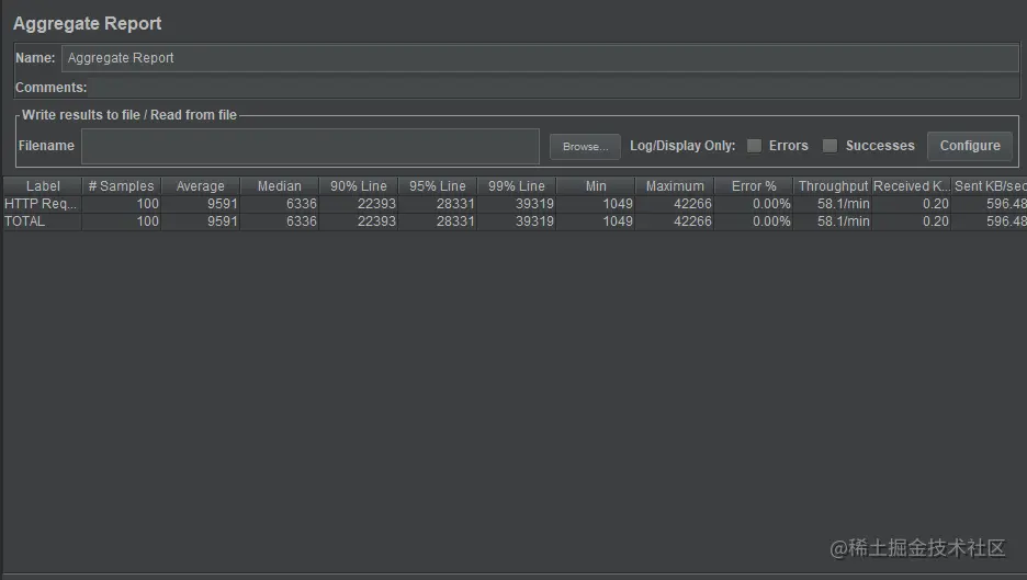 下面这个是对Tomcat的测试,用jmeter启动10个线程循环10次,也就是发出100个Http请求,附带605KB的图片的压测结果。