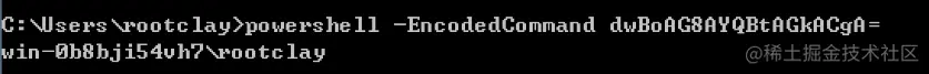 我们先使用上面一个表格提到的编码代码编码命令 whoami, 得到字符串:dwBoAG8AYQBtAGkACgA=