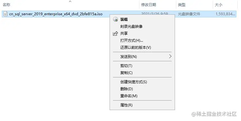 - 下载 SQL Server 2019 安装镜像后,右击,选择“装载”。