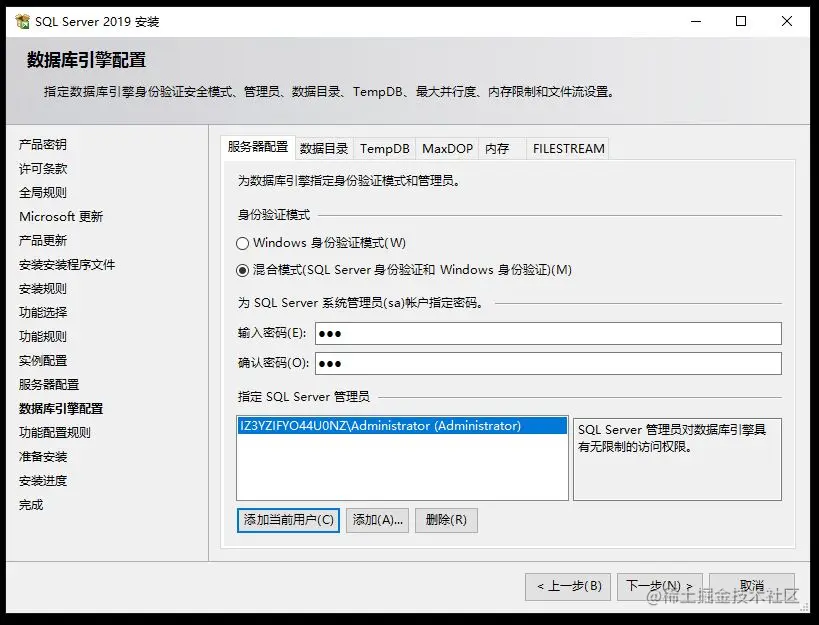 - 选择“混合模式(SQL Server 身份验证和 Windows 身份验证)”,然后指定系统管理员(sa)密码。