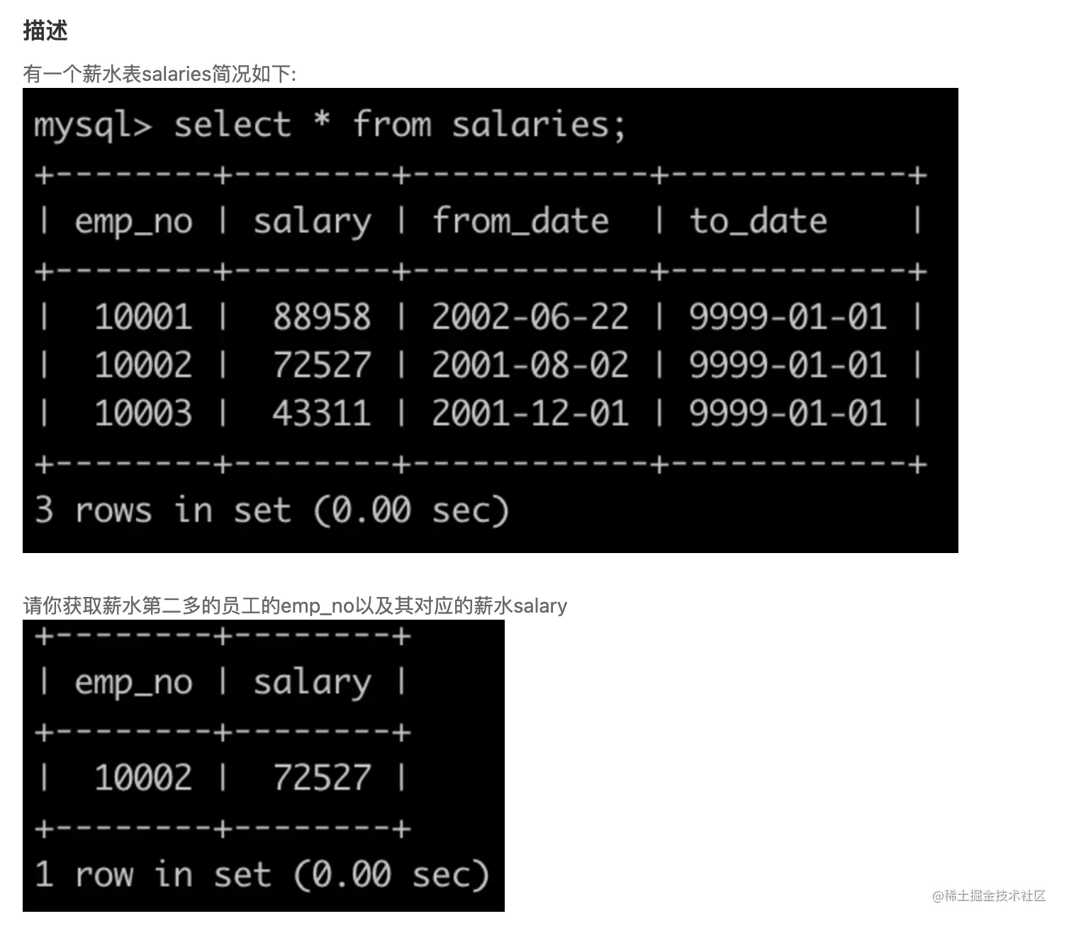 - SQL17 获取当前薪水第二多的员工的emp_no以及其对应的薪水salary(简单)