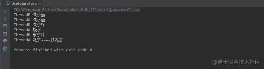线程A需要完成洗水壶,烧水的工作,完成后等待线程B将洗茶壶,洗茶杯,拿茶叶三个步骤做完,所以线程A在内部需要等待线程B执行完毕才能完成最后泡茶的工作,这里可以采用Thread.join,CountDownLatch,Future都可以实现,以Future为例。