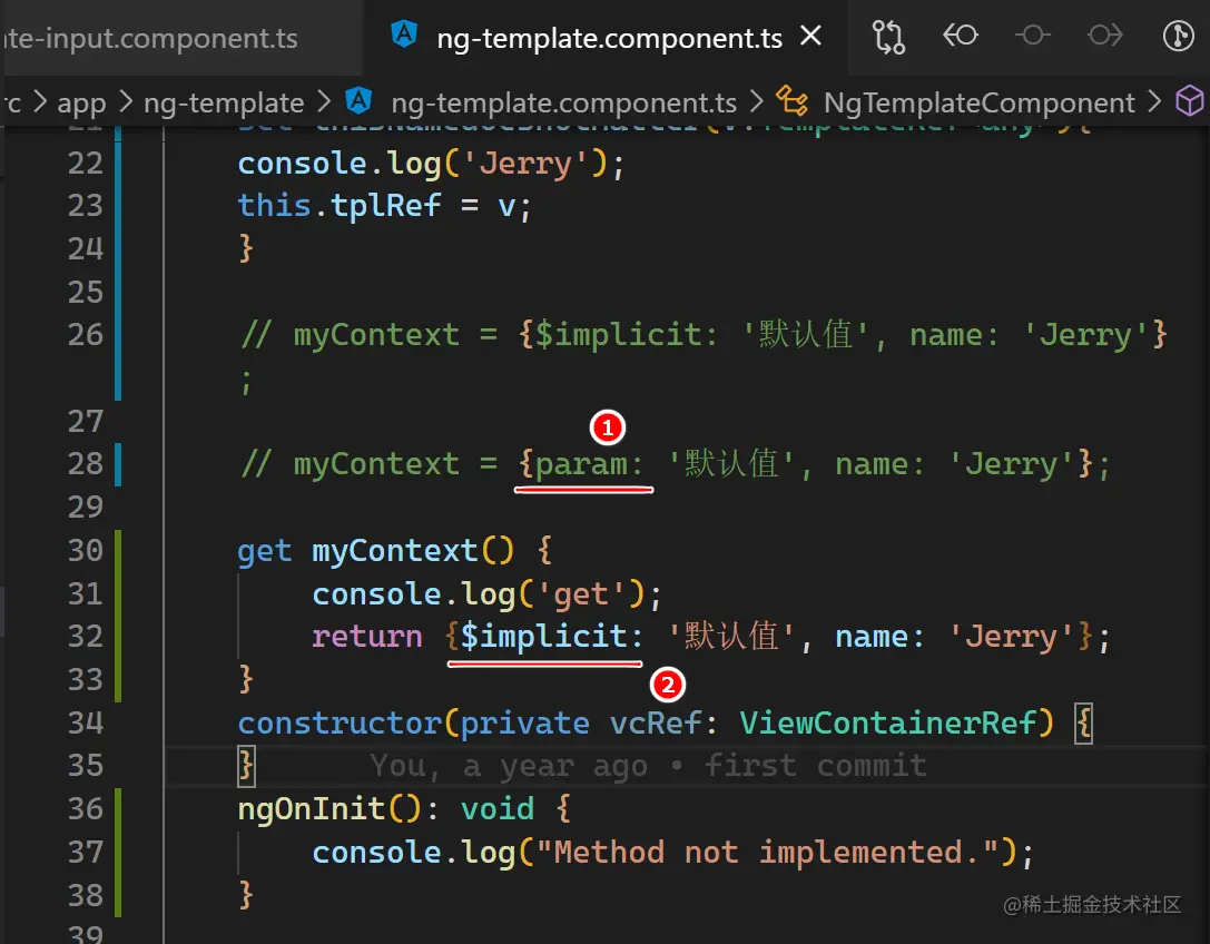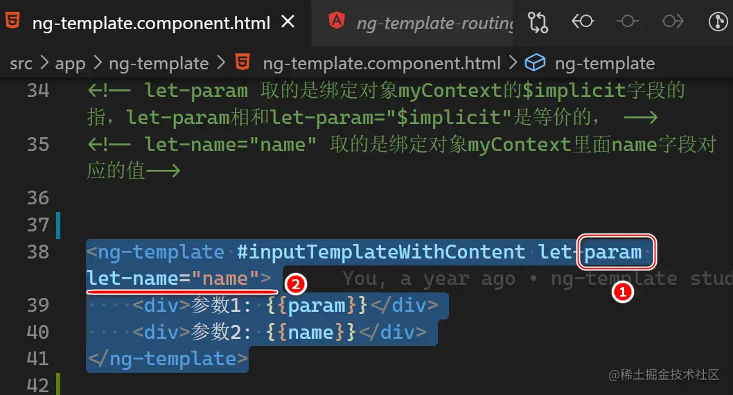 这里对于上图的代码位置 2,我用关键字 let-,定义了一个仅模板里能够访问的局部变量 name,其数据源来自传入该模板的上下文对象 context 的同名属性 name。
