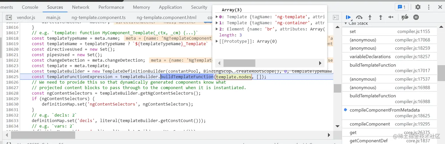 从下面这个调用栈里还能观察到模板里包含的 HTML 元素,在内存中对应的 DOM 节点: