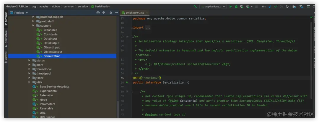 Dubbo已经定义好序列化策略的扩展点Serialization(从@SPI注解可以看出是一个SPI扩展点)