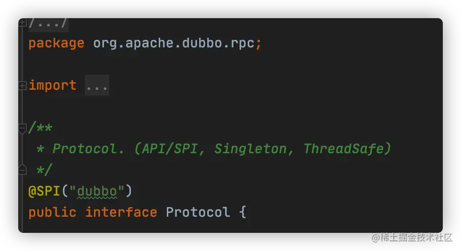 @SPI注解作用于扩展点上,表明该接口是一个扩展点,可以被Dubbo的ExtensionLoader加载。前文中的 org.apache.dubbo.rpc.Protocol 接口就是一个扩展点: