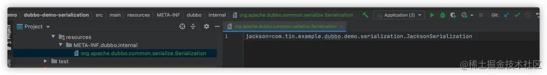根据Dubbo扩展实现的原理,Dubbo会从这个目录加载扩展,我把key定义为jackson,如下: